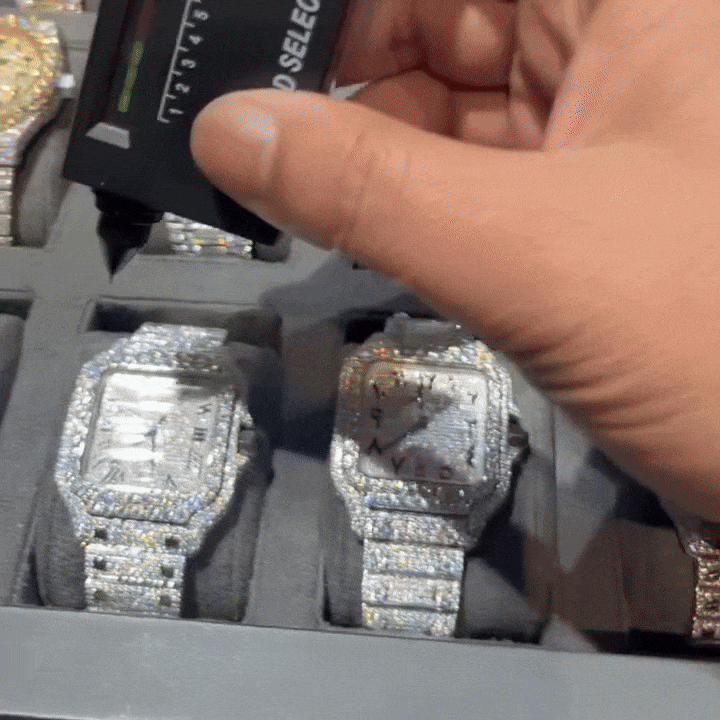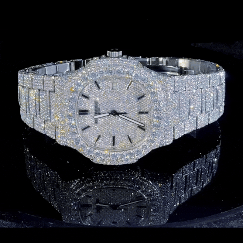 We use a mix of the highest-grade diamond simulants and moissanite stones, all handset by professional jewelers — never glued. Combined with a luxury-grade stainless steel case and band, you get the same look, weight, and shine as a $30K bustdown for a fraction of the price.