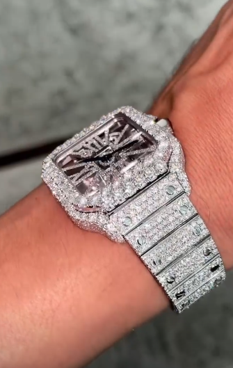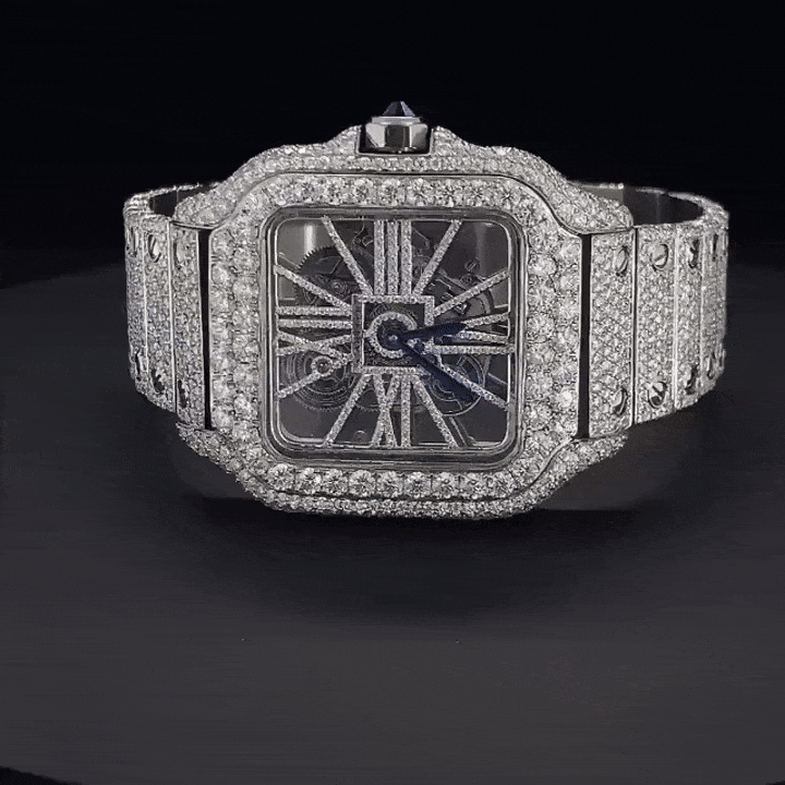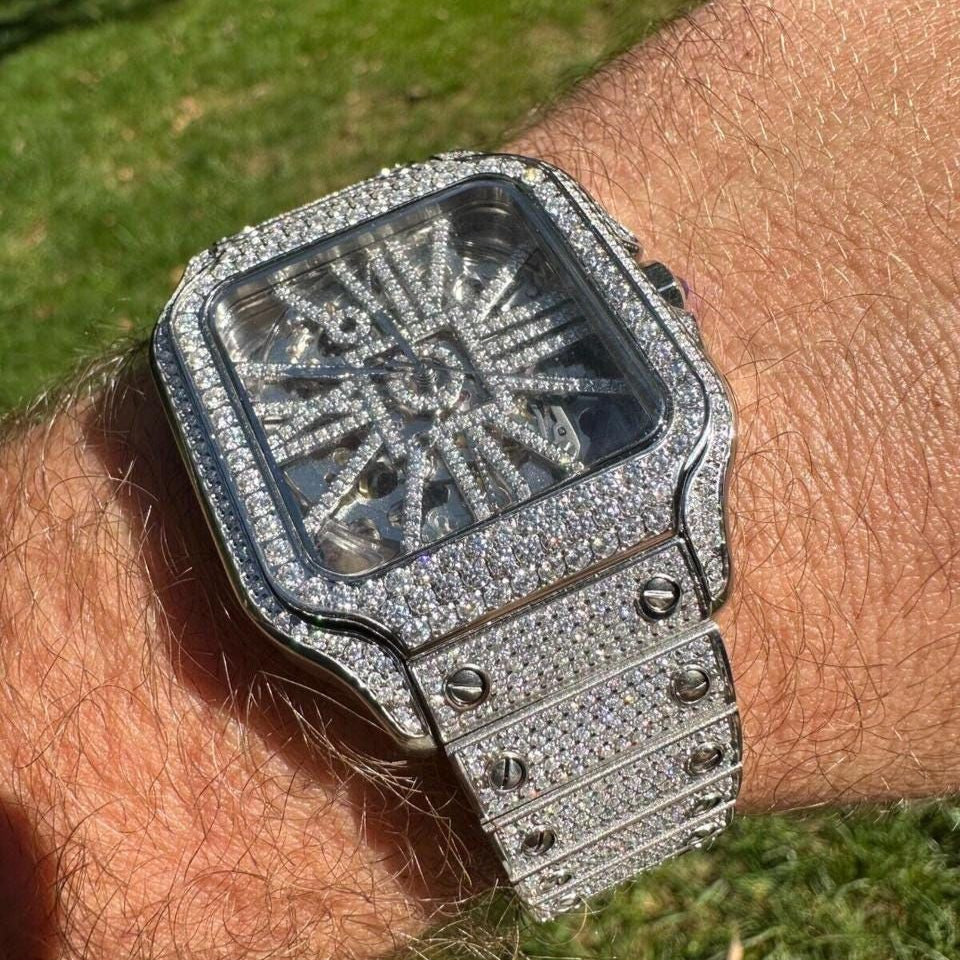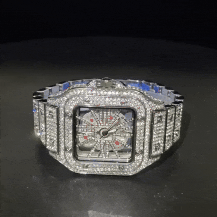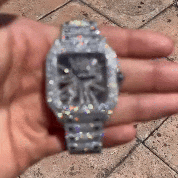 We use a mix of the highest-grade diamond simulants and moissanite stones, all handset by professional jewelers — never glued. Combined with a luxury-grade stainless steel case and band, you get the same look, weight, and shine as a $30K bustdown for a fraction of the price.